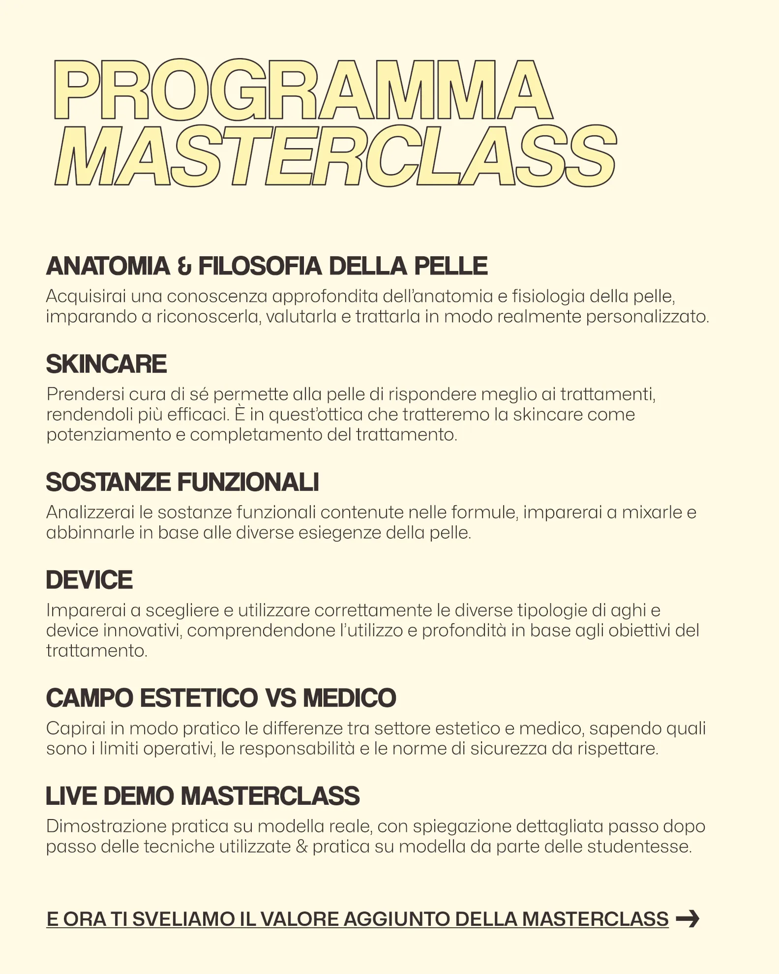 La Master entrerà nel merito di ciascuno dei punti sopra lavorando su modella, così come avranno modo studenti e studentesse di fare lo stesso sotto la sua supervisione.