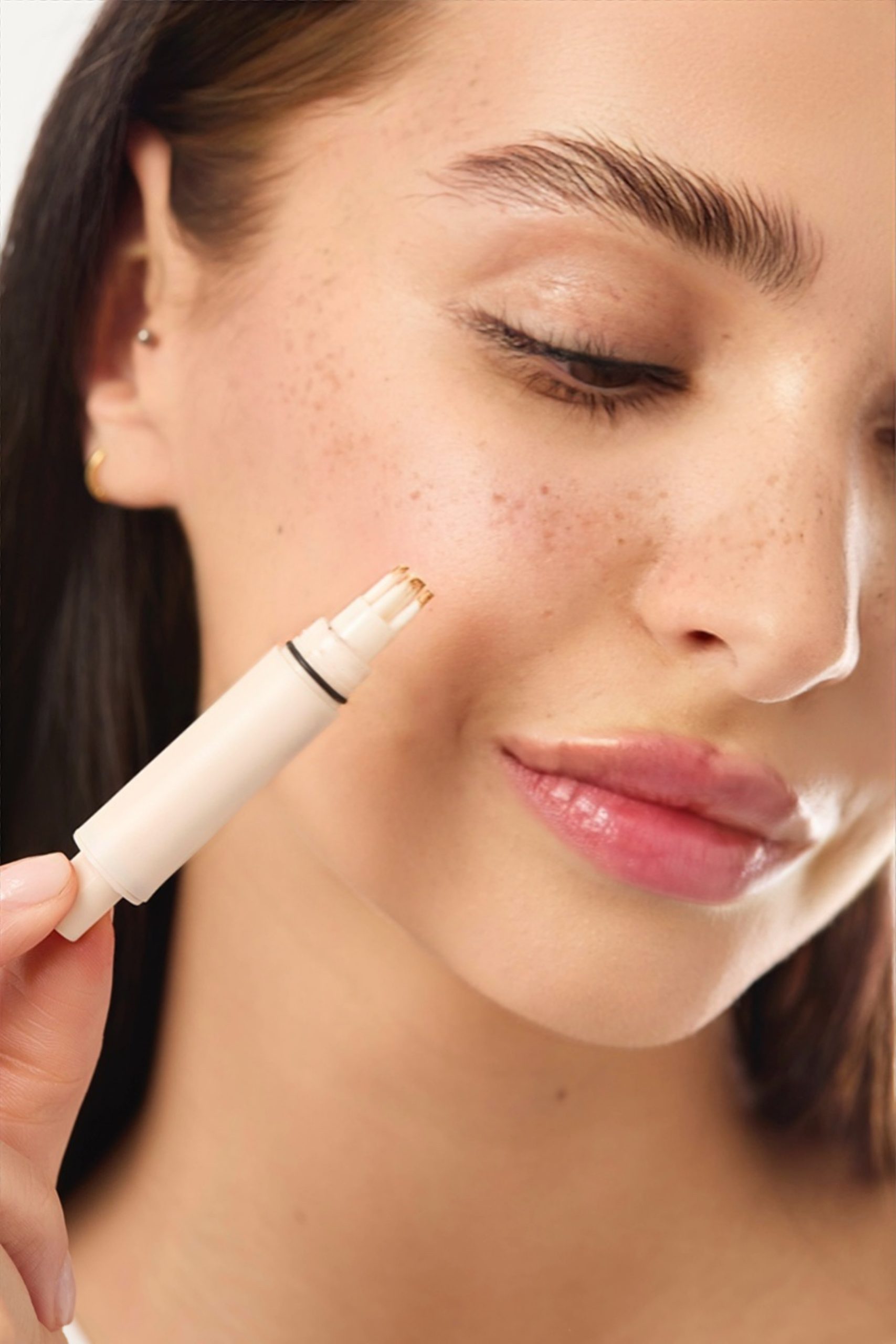 preleva una piccola quantità di prodotto con l'applicatole e ricrea sul viso le lentiggini